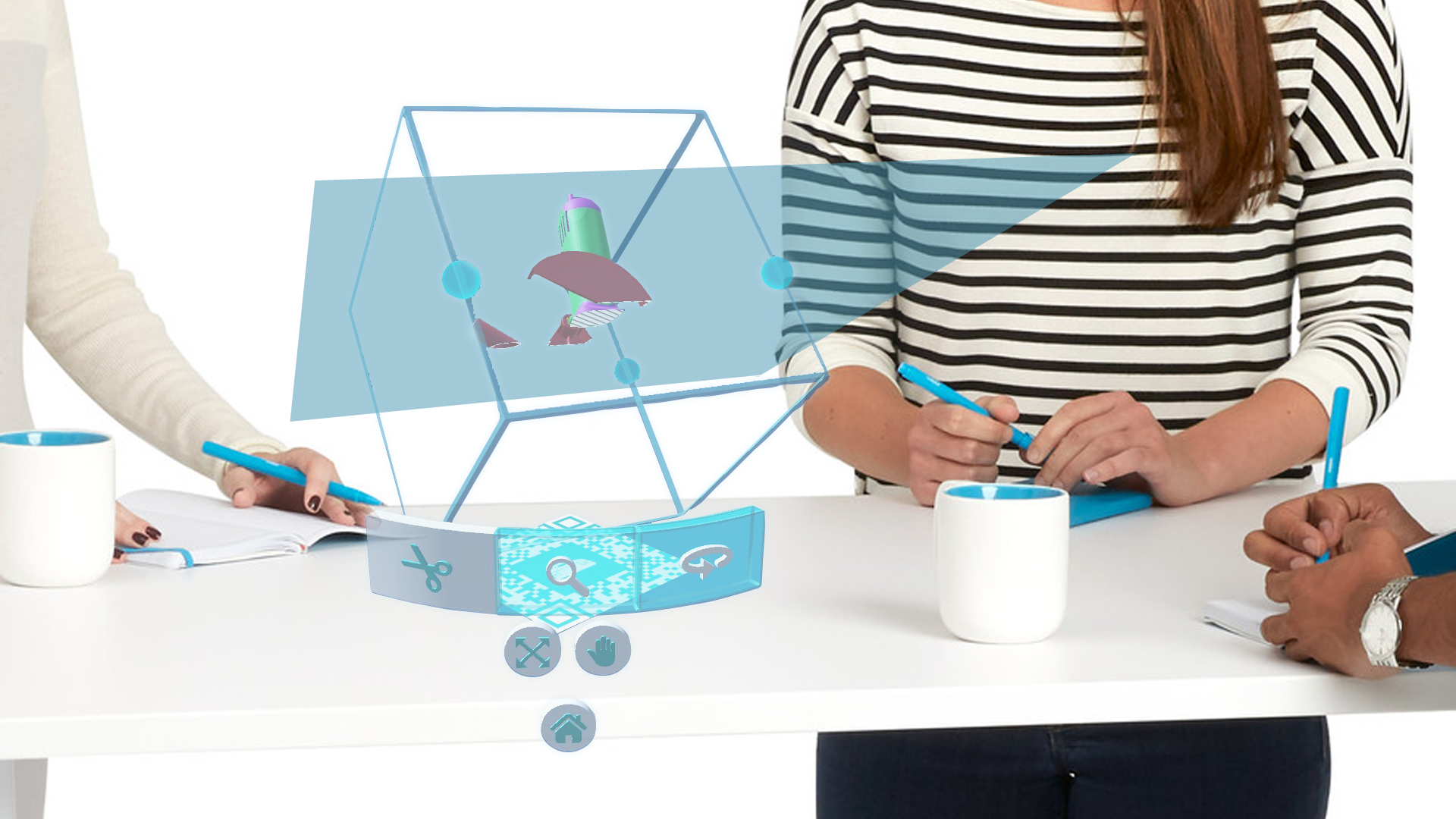 Cette application sur les lunettes de Réalité Augmentée DAQRI permet à plusieurs utilisateurs d'interagir ensemble sur un usinage virtuel préalablement conçu dans un logiciel de CAO. Tous les utilisateurs peuvent ainsi visionner et tourner autour de la pièce virtuelle comme si elle existait réellement, en lévitation au dessus de la table de réunion. Chacun peut également orienter, agrandir/réduire ou appliquer un plan de coupe sur la pièce. Pour éviter tout désagrément, un seul utilisateur ne peut agir sur la pièce en même temps, les autres utilisateurs doivent demander pour prendre la main.