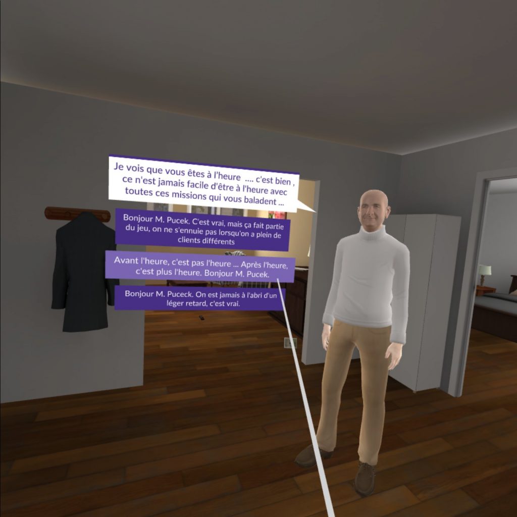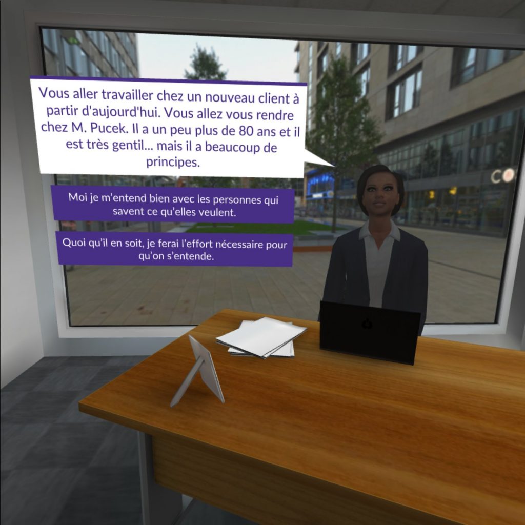 Cette application plonge l'utilisateur dans la peau d'un(e) aide à domicile afin de découvrir le métier puis d'évaluer les habililetés déjà existantes avant une possible reconversion. Tout au long de son expérience, l'utilisateur doit réaliser les différentes tâches demandées dans son ordre de mission disponible sur sa montre connectée (virtuelle). Ces tâches assurent l'hygiène, la propreté, la sécurité et le bien-être de l'aidé. Chacune de ces actions font évoluer le score final graduellement. Ramasser la cane tombée au sol donne par exemple quelques points mais moins que la placer dans le porte cane.